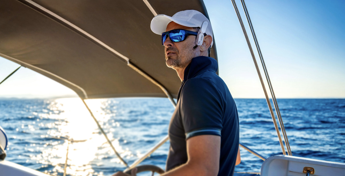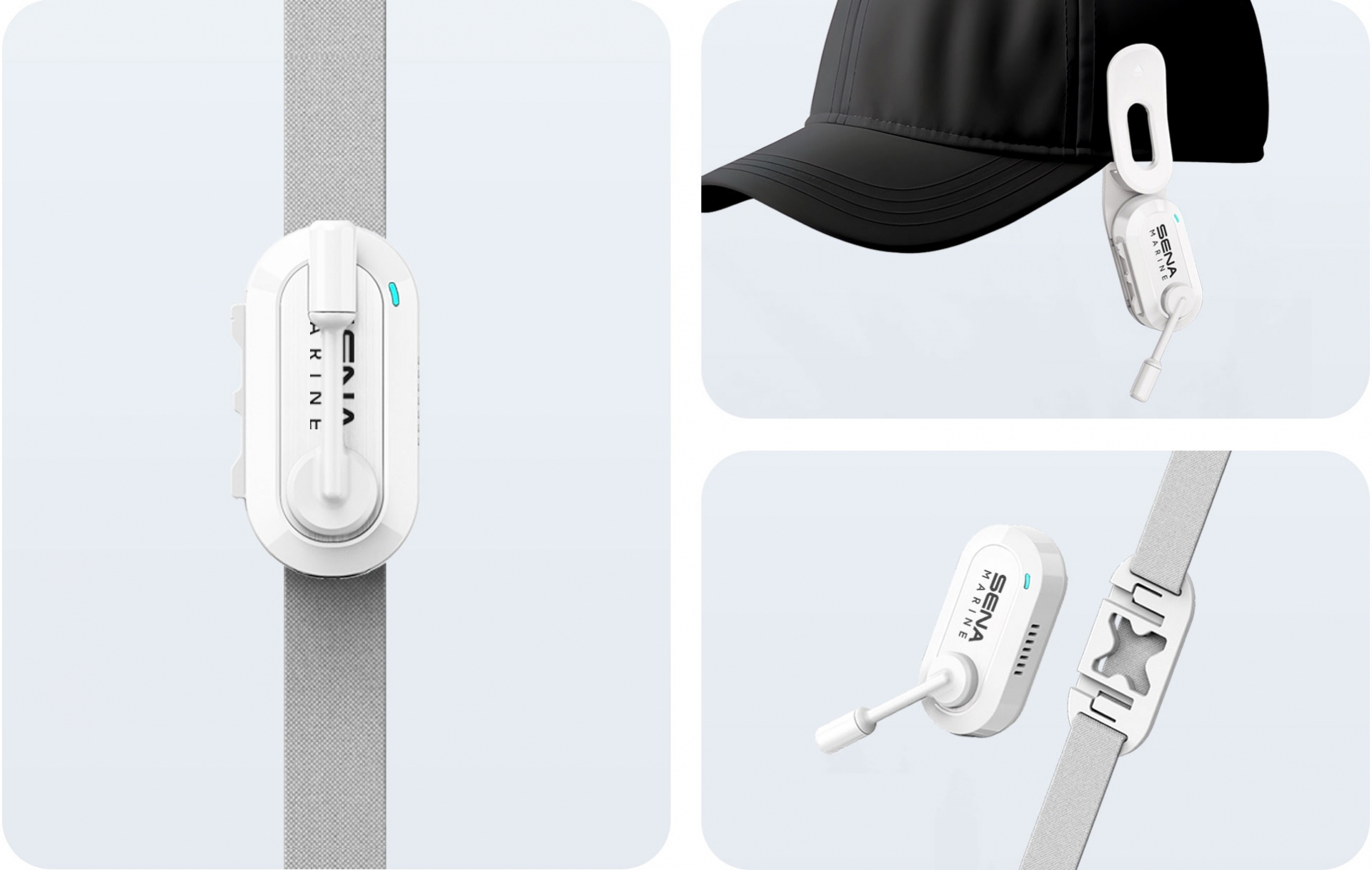 IPX5の防水性能を備え、キャップや海上用ヘルメットのストラップに簡単に取り付けて使用できる、片耳タイプの軽量ヘッドセット。